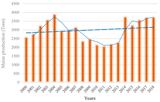The trend in maize data from 2000 to 2018 depicts an increasing trend with a magnitude of 29.36 tons per annum (Figure 9). However, this trend is not statistically significant (p = 0.599).