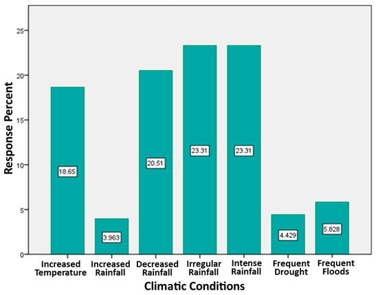 The questionnaire administered to 100 smallholder farmers revealed that 97% of the respondents believed climate variability negatively affects their maize yields and have witnessed a drop in their maize yield over the last two decades. The respondents also pointed out a decrease in rainfall, high rainfall intensity, and irregularity as the main prevailing climatic conditions in the area over the past 20 years, followed by increased temperatures (Figure 10). A diminution in annual rainfall, and an increased irregularity in rainfall patterns coupled with a temperature rise may lead to drought which affects maize yield. The results from the survey confirm those obtained from the Mann–Kendall and Sen’s slope statistical tests, which showed that rainfall is decreasing in the municipality with a magnitude of 4.94 mm per annum, and maximum temperatures are increasing at 0.011 °C per annum.