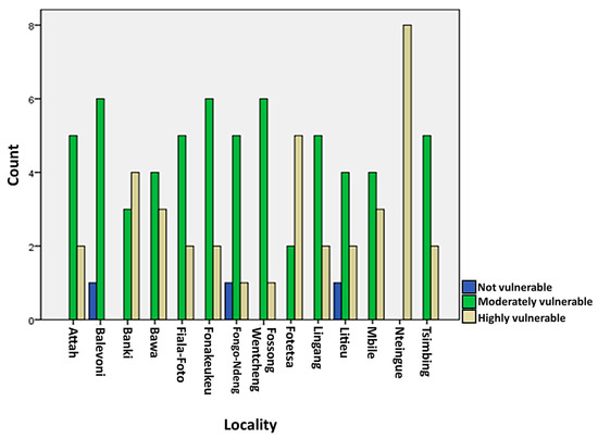 The level of farmers’ vulnerability is also linked to the locality where their farming activities are carried out. The municipality of Dschang comprises 14 agricultural stations; each station is found in a different locality with varying altitudes. Based on this, the vulnerability of farmers to climate variability in the localities differs (Figure 12). The highest vulnerability is reported to be in the locality of Nteingue (a low-lying area). All the surveyed farm operators (8% of respondents) in this locality have reported their activities as being highly vulnerable to climate variability, as this locality has been hit by floods every 9 months for the past 10 years.