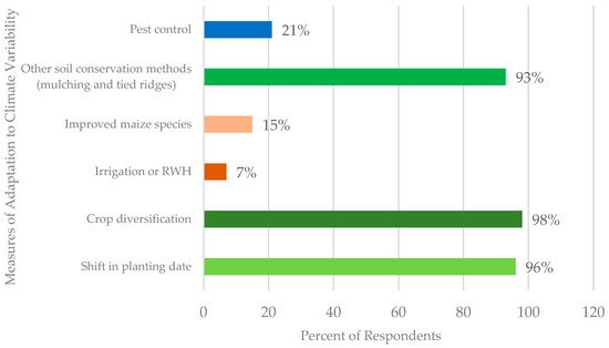 Crop diversification (a soil conservation technique) is the most applied adaptation measure to climate variability in Dschang, with over 98% of respondents having recourse to it. The second highest adaptation measure is the shift in planting dates, comprising 96% of the surveyed farmers, followed by other soil conservation techniques (93%), particularly mulching and tied ridges. Irrigation, the use of improved maize seeds, and pest control are the least practiced adaptation measures by the farmers, with 7, 15, and 21%, respectively (Figure 14).