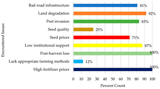 According to the respondents, climate variability is not the sole cause of maize yield decrease. Other factors also influence farmers’ productivity. These factors include high fertilizer prices, lack of appropriate farming methods, post-harvest loss, low institutional support, lack of access to improved seeds, pest invasion, land degradation, and the state of road infrastructure (Figure 15). The most constraining issues encountered in maize farming activities, according to the respondents, are high fertilizer prices, post-harvest loss, land degradation, and low institutional support. The respondents unanimously agreed to the fact that these factors, in addition to climate variability (decreased and irregular rainfall, and increased temperature), are the ones that greatly hamper their maize crop productivity, with the price of fertilizer perhaps having more negative impacts on productivity than climate variability.