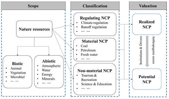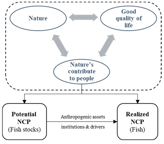 NCP provides a new perspective for understanding the value of natural resources through the interactions between people and nature (Figure 1). From different perspectives, NCP can be divided into potential and realized NCP [37,38]. From the perspective of nature’s contribution, potential NCP refers to the ability of an ecosystem to provide NCP. This can be a service when coupled with people’s needs. For example, the ocean contains abundant fish and other biological resources that do not depend on the current levels of human utilization. From the perspective of people’s needs, realized NCP refers to humans’ actual utilization of natural resources, which depends on current human technology and knowledge levels, such as the amount of food provided and the ability to treat diseases. Potential NCP often needs human inputs, such as anthropogenic assets and relevant institutions, to become realized, which can positively or negatively contribute to the quality of life. For example, marine ecosystems provide seafood through aquaculture, but humans can only obtain seafood through human inputs such as ships and fishing gear. Therefore, this study discusses the value of natural resources from the dual dimensions of nature’s contribution to people: (i) people’s needs and (ii) nature’s contributions.