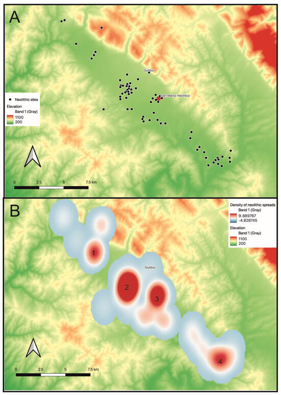 (A) Distribution of Neolithic sites in the valley; (B) Heatmap of Neolithic activity based on the spreads of lithic and ceramic material recorded during the Gubbio Survey, using kernel densities estimation. A. Red dot is San Marco. ‘Numbers 1–4 in B refer to clusters of sites cited in the text.