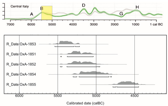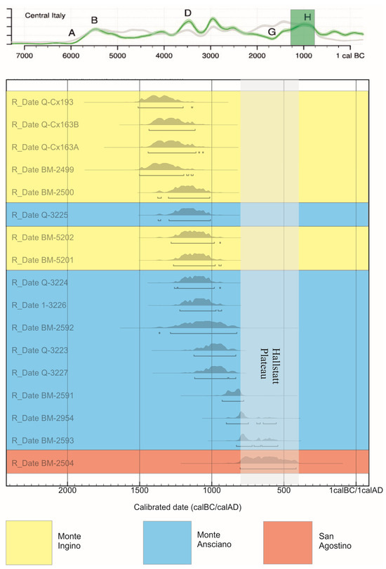 The Bronze and Early Iron Age radiocarbon dates of Gubbio in the regional context of Central Italy presented here [9], showing the clear transition between the sites of Monte Ingino, Monte Ansciano and San Agostino, allowing for the complexities of the Hallstatt plateau in the calibration curve. Calibration data based on [10,11]. A–H refer to significant changes in the “demographic” curve.