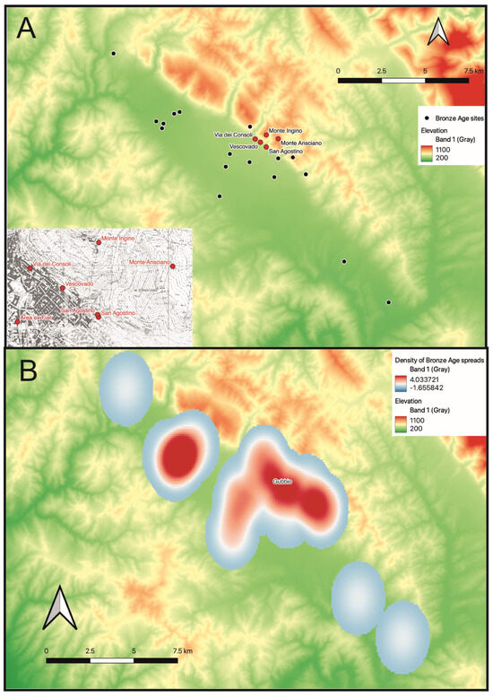(A) Distribution of Bronze Age sites in the valley and (inset) excavated sites around Gubbio; (B) Heatmap of Bronze Age activity based on the spreads of ceramic material recorded during the Gubbio Survey, using kernel densities estimation.