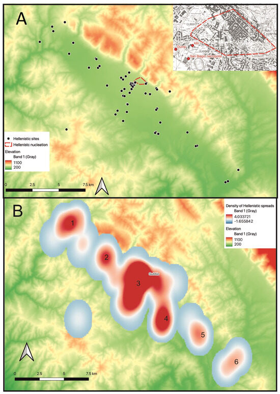 (A) Distribution of Hellenistic sites in the valley with inset showing the Gubbio area; (B) Heatmap of Hellenistic activity based on the distribution of ceramic material recorded during the Gubbio Survey, using kernel densities estimation. The same scale of density of pottery is employed for Figure 10 and Figure 12. Numbers 1–6 refer to clusters of sites cited in the text.