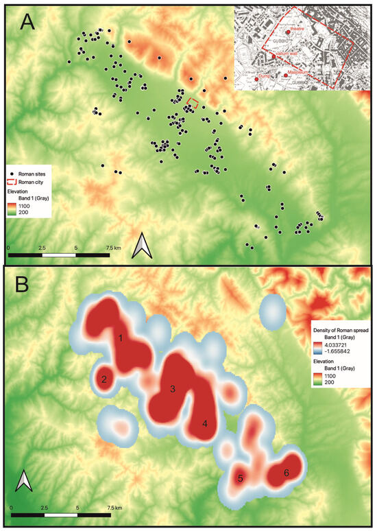 (A) Distribution of Roman sites in the valley (with inset showing sites in the Gubbio area); (B) Heatmap of Roman activity based on the spreads of ceramic material recorded during the Gubbio Survey, using kernel densities estimation. The same scale of density of pottery is employed for Figure 10 and Figure 11. Numbers 1–6 refer to clusters of sites cited in the text.
