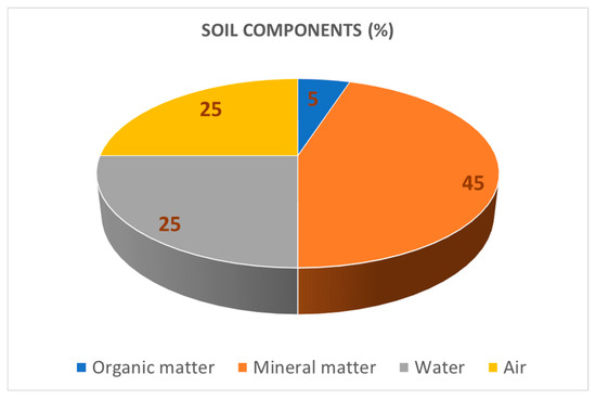 A natural soil is composed by solids and fluids (air and water). As a common rule, most of the Soil Science manuals state that the ideal volume proportion between soil solids, soil water and air would be approximately 50:25:25 expressed in percentage (Figure 2). Considering the solid fraction of the soil, the estimation is that 45% corresponds with mineral matter and 5% organic matter [31].