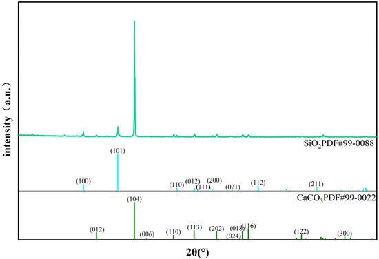 The karst area of Saidi, Lingchuan County, Guilin City, and the non-karst area of Shegongping, Lingchuan County, Guilin City, provided the karst and non-karst soils, respectively, which were employed in the experiment. Samples were collected using the mixed sample methodology, which guaranteed the representativeness of the samples. According to the diagonal sampling technique, the diagonal line in the sample region was divided into five equal portions, and each equal point was selected as the sampling point. A collection of 0–10, 10–20, and 20–30 cm of surface soil was made. The soil was then mixed uniformly and left in the laboratory to dry naturally. Processing was carried out with the specifications of the Land Quality Geochemical Evaluation” (DZ/T 0295-2016) standard [27]. Table 1 displays the physicochemical parameters of the soils. The X-ray diffractometer identified the mineral composition of the limestone samples, which were obtained in Shegongping, Lingchuan County, Guilin City, as CaCO3 and a trace amount of SiO2 (Figure 2). The collected soil and limestone samples were naturally air-dried in the chamber, and the large stones and plant residuesin the soil samples were removed before being ground with ceramic mortar and screened through 100 mesh (0.149 mm). The samples were acquired using the quarter method. The residual soil samples were filtered with 20 mesh (2 mm) and put in plastic bags for sealing and preservation. Before being loaded into the experimental column, limestone was broken up with a hammer and ground into 1–3 mm particles using a ceramic mortar. Superior pure ZnCl2, which was obtained from Xilong Science Co., Shantou, China. and diluted with ultrapure water to the appropriate concentration before the experiment, was the experimental reagent employed in the study. Before being dried under 50℃ in an electric blast drying oven and stored for later use, the high-purity quartz sand used in the laboratory was washed of surface impurities using tap water, and then soaked in and cleaned with ultrapure water.