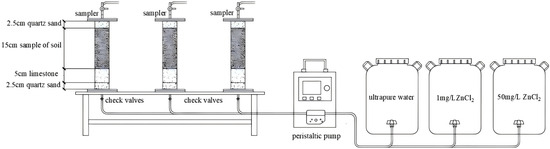 Figure 3 displays the schematic diagram of the experimental setup. An acrylic column, 25 cm in height and with an inner diameter of 5 cm, was used for the experiment. The column was filled with circular qualitative filter paper, 2.5 cm of quartz sand, 5 cm of limestone, 15 cm of test soil, and 2.5 cm of quartz sand from bottom to top before the experiment. Quartz sand was added to ensure that the inflow solution could pass through the material in the column uniformly [32]. The column was then connected to a peristaltic pump and exposed to three different concentrations of ZnCl2 (0, 1, and 50 mg/L) by pumping the solution upward. Periodic samples were taken from the column effluent and analyzed for HCO3− content using a titration kit with an accuracy of 0.1 mmol/L. The samples were then filtered through a nylon microporous membrane with a pore size of 0.45 μm and analyzed using ICP-OES, (PerkinElmer, Waltham, MA, USA, Optima 7000DV) to measure changes in Zn2+, Ca2+, and Mg2+ concentrations under altered conditions. Experiments were conducted to characterize soil and limestone and to analyze surface dissolution and crystal attachment.
