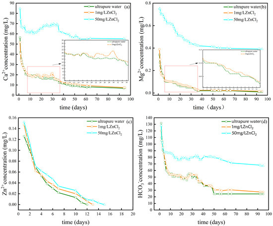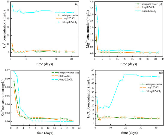 The change in ion concentration with the flow rate of aqueous solution (1.23 mL/min): (a) Ca2+; (b) Mg2+; (c) Zn2+; (d) HCO3−.