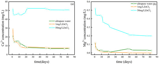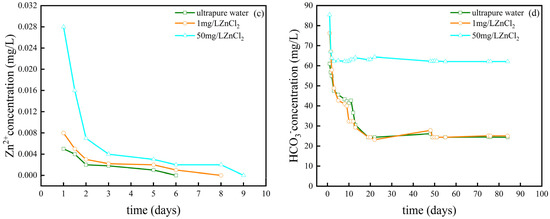The concentration of Mg2+ in the liquid sample is shown in Figure 4b, trajectory to that of Ca2+, decreasing with time until it stabilized within a narrow range. Compared to the Ca2+, the Mg2+ content was substantially less than 1 mg/L at the initial concentration. The explanation for this is that the dissolution-precipitation interaction of the limestone with the Zn2+ produced the Ca2+ found in the liquid samples. The X-ray mineral diffraction (XRD) revealed that the sample’s primary mineral components were CaCO3 and a trace quantity of SiO2. No Mg-containing inorganic compounds were found, indicating that the Mg2+ likely originated from the cation exchange between the Zn2+ and the karst soil. The Mg2+ content reached a peak of 0.75 mg/L on the first day of the 50 mg/L experimental column and dropped to a low of 0.1 mg/L on the 92nd day of the ultra-pure water experimental column [35]. Prior studies have demonstrated that bivalent Zn, Cd, Ni, Mn, and other cations exhibit high adsorption onto the surface of calcium carbonate [36]. The Zn2+ was adsorbed and rapidly decreased in the soil-limestone system, as shown in Figure 4c. The coarse texture of limestone offers stable contact and serves as an adsorption site for Zn2+ [37,38]. Chemisorption takes place when a 1 mg/L ZnCl2 solution interacts with a karst-soil-limestone system, whereas at a higher concentration of 50 mg/L ZnCl2 solution, metal ions mostly adhere to carbonate minerals via cation exchange and precipitation. When Zn2+ reacts with CO32− and OH−, it forms Zn5(OH)6(CO3)2 (hydrozinkite) and a small quantity of ZnCO3 on the mineral’s surface [33]. The concentration of Zn2+ in each experimental column decreased to 0 on the 12th, 13th, and 15th days, respectively. In Figure 4d, the concentration of HCO3− fell considerably within 1–10 days under the influence of varying Zn2+ concentrations, followed by a gradual fall stage. The concentration of HCO3− reached a steady level on the 63rd day of the experiment. HCO3− content in the outflow liquid of the ultra-pure water, 1 mg/L ZnCl2, and 50 mg/L ZnCl2 test columns were measured at 24.41 mg/L, 30.51 mg/L, and 73.22 mg/L, respectively. Both low and high concentrations of the Zn solution promoted the dissolving of the limestone, with a more pronounced effect observed at higher concentrations.
