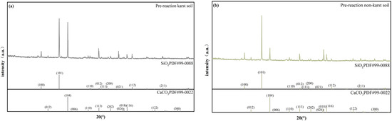 The initial samples of karst and non-karst soils were analyzed using X-ray diffraction (XRD) to determine the nature of the soil surface deposits. The results are displayed in Figure 7, where the X-ray diffraction patterns of both soils are dominated by strong peaks of SiO2, while the diffraction peaks of the CaCO3 are relatively weak.