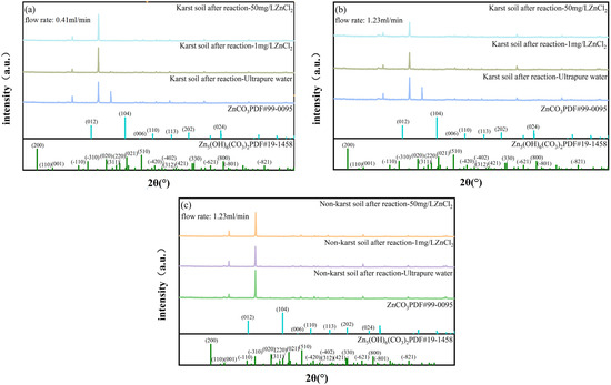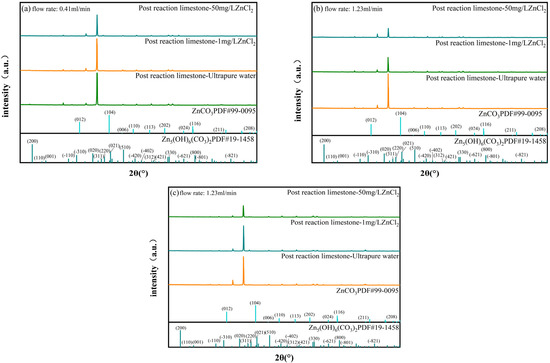 Figure 9 displays the X-ray diffraction patterns of the limestone under several experimental conditions: low flow rate (for karst soil), high flow rate (for karst soil), and high flow rate (for non-karst soil). It is clear from the three experimental setups that CaCO3 continued to dominate the strong peak composition of limestone, and there was little change in the general distribution features of the diffraction peaks. However, the diffraction peak of CaCO3 in the limestone shows a more obvious downward trend at 1 mg/L and 50 mg/L ZnCl2 (Figure 9a). At 1.23 mL/min, the diffraction peak strength of CaCO3 in limestone drops significantly as the Zn2+ concentration increases (Figure 9b,c). This phenomenon can also play a significant role in the Ca2+ rising stage of hydrochemistry. It also confirms that, in the presence of high flow velocity, the erosion effect of water flow on the soil-limestone system promotes the decomposition of CaCO3. In non-karst soil, the peak value of CaCO3 in limestone with 1 mg/L and 50 mg/L ZnCl2 involvement is larger than that in karst soil. This phenomenon’s occurrence confirms the hydrochemical analysis’s conclusions about the impact of limestone’s specific surface area and non-karst soil on Zn2+ adsorption capability. Furthermore, the XRD pattern of the limestone indicates high peaks in the positions of the Zn5(OH)6(CO3)2 and ZnCO3 peaks, with an intensity trend comparable to that of the soil. These findings support the formation of two distinct types of precipitates on the surfaces of the soil and limestone in the soil-limestone system.