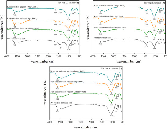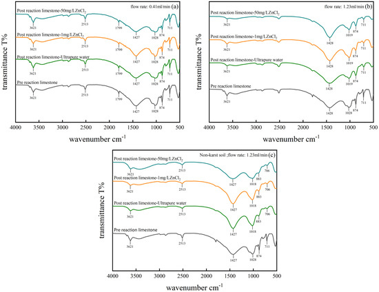 FT-IR profiles of limestone: (a) Group I, karst soils, 0.41 mL/min; (b) Group II, karst soils, 1.23 mL/min; (c) Group III, karst soils, 1.23 mL/min.