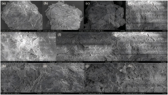 SEM images of soil: (a) karst soil before the reaction; (b) the ultra-pure water was injected at a flow rate of 0.41 mL/min; (c) 1 mg/L ZnCl2 was administered at a flow rate of 0.41 mL/min; (d) 50 mg/L ZnCl2 was administered at a flow rate of 0.41 mL/min; (e) the ultra-pure water was injected at a flow rate of 1.23 mL/min; (f) 1 mg/L ZnCl2 was injected at a flow rate of 1.23 mL/min; (g) 50 mg/L ZnCl2 was injected at a flow rate of 1.23 mL/min; (h) pre-reaction non-karst soil; (i) the ultra-pure water was injected at a flow rate of 1.23 mL/min; (j) 1 mg/L ZnCl2 was injected at a flow rate of 1.23 mL/min; (k) 50 mg/L ZnCl2 was injected at a flow rate of 1.23 mL/min; (a–g) the soil condition is karst soil; the soil condition of (h–k) is non-karst soil.