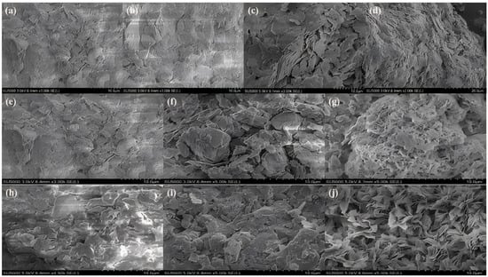 SEM images of limestone: (a) limestone before reaction; (b) ultrapure water passed at a flow rate of 0.41 mL/min; (c) 1 mg/L ZnCl2 passed at a flow rate of 0.41 mL/min; (d) 50 mg/L ZnCl2 passed at a flow rate of 0.41 mL/min; (e) the ultra-pure water was injected at a flow rate of 1.23 mL/min; (f) 1 mg/L ZnCl2 at a flow rate of 1.23 mL/min; (g) 50 mg/L ZnCl2 at a flow rate of 1.23 mL/min; (h) 1 mg/L ZnCl2 at a flow rate of 1.23 mL/min to ultrapure water; (i) 1 mg/L ZnCl2 at a flow rate of 1.23 mL/min; (j) 1 mg/L ZnCl2 at a flow rate of 1.23 mL/min flow rate through 50 mg/L ZnCl2; (a–g) soil conditions are karst soils; soil conditions in (h–j) are non-karst soils.