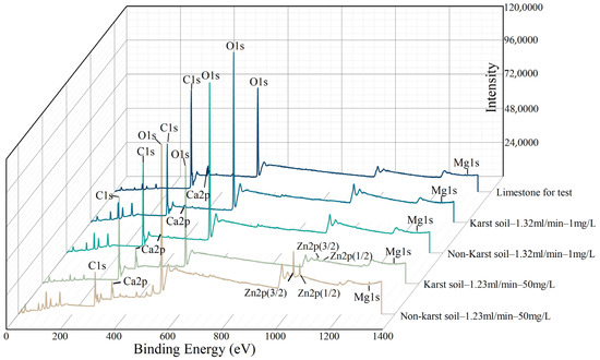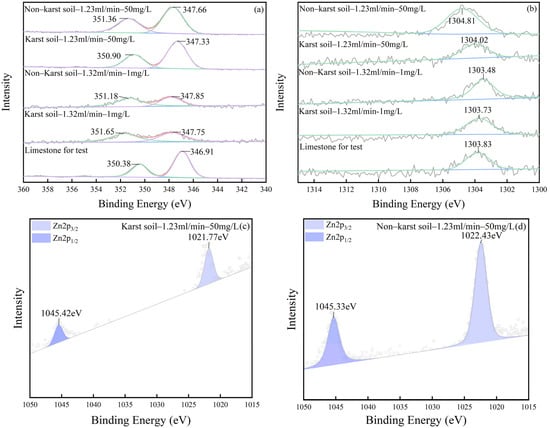 The full spectrum of the binding energy on the limestone surface under various soil conditions to confirm the chemical composition of the new solid phase on the limestone surface was plotted (Figure 14). The energy spectrum peak at 284.80 eV was associated with the calibration peak of C1s. With binding energies of 346.91 eV and 350.83 eV, respectively, the Ca2p spectrum can be split into two typical peaks, and Mg1s is responsible for the weak energy spectrum peak at 1303.83 eV. The reacted limestone, Zn2p, exhibited a double-peak type, with corresponding binding energies of 1021.8 eV and 1044.8 eV. For the Ca2p, Mg1s, Zn2p1/2, and Zn2p3/2, the narrow spectrum spectra are displayed to further ascertain the elemental morphology. The Ca2p’s narrow spectrum shows that the changes in the concentration conditions had a significant impact on the chemical environment of the limestone surface (Figure 15a); changing the environmental conditions from top to bottom increased the binding energy by 0.98 eV, 0.19 eV, −0.35 eV, and −0.1 eV, respectively (Figure 15b). The chemical shift and peak were both dramatically altered. The low concentration of ZnCl2 and soil participation enhanced the binding energy, although the peak value fell significantly. The peak value of the Mg2+ was higher in habitats with high concentrations, high flow rates, and no karst soil than it was in other settings. The peak value of the Mg2+ was larger than in other contexts, when the concentration and flow rate were high and the soil was non-karst; that is, the Mg2+ content was relatively high in these situations. When the full spectrum of the binding energy of the limestone surface was observed, the Zn exhibited more prominent spectral peaks, indicating that Zn2+ was transferred from the solution to the limestone’s surface. When combined with the findings of earlier XPS studies of Zn compounds, the main Zn2p peak on the surface of the reacted limestone was a bimodal peak, and the main peaks of Zn2p1/2 and Zn2p3/2 [32] had narrow spectra, as shown in Figure 15c,d. The corresponding binding energies were 1045.33 eV, 1022.43 eV, 1045.42 eV, and 1021.77 eV. The appearance of the Zn-bearing solid phase on the limestone surface following the reaction in the Zn-bearing solution was further confirmed by comparing the XPS results for the limestone powder after the passage of 50 mg/L ZnCl2 solution under various soil conditions. Characteristic peaks appeared in both samples near 1045 and 1022 eV, which corresponded to the Zn2p1/2 and Zn2p3/2 standard peak positions.