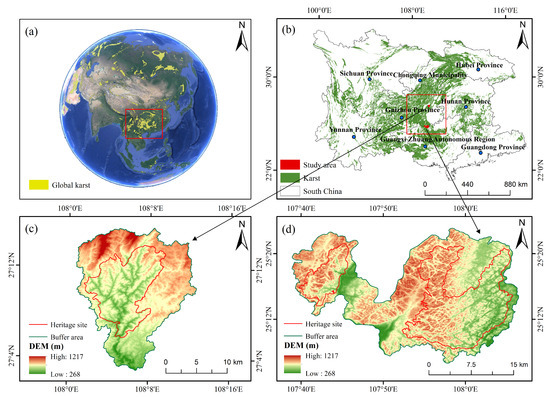 The geographical location map of the research is: (a) the location of karst in the eight provinces of southwest China in the global karst; (b) eight provinces in southwest China are located in karst; (c) Shibing Karst WNHS; and (d) Libo-Huanjiang Karst WNHS.