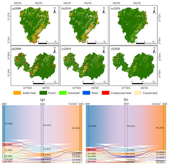 Land cover maps of study area ((a–c) refer to the land use of the Shibing Karst WNHS in 2000, 2010, and 2020; (d–f) refer to the land use of the Libo-Huanjiang Karst WNHS in 2000, 2010, and 2020) and land use transfer matrix; (g) Shibing; (h) Libo-Huanjian.