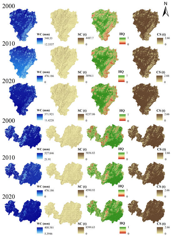 Distribution of ESs in 2000, 2010, and 2020 (WC—Water conservation, SC—soil conservation, HQ—Habitat quality, CS—Carbon storage).