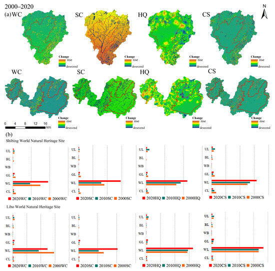 With regard to the spatial distribution of WC and CS in the Shibing and the Libo-Huanjiang, the overall pattern has changed little. The high values are focused on the WNHS, while the low values are found in the construction land and the water areas in the buffer zones. The high values of HQ in the two study areas are concentrated in the woodland and grassland areas within the heritage sites and buffer zones. In contrast, the low values are primarily focused on the CL and BL areas. The high values of SC in the Shibing are concentrated in the northern region, with a gradual decrease in the south. In contrast, the SC in the Libo-Huanjiang is concentrated in the southeast, with a corresponding decrease in the south. The negative values are distributed primarily in the buffer zone (Figure 3).