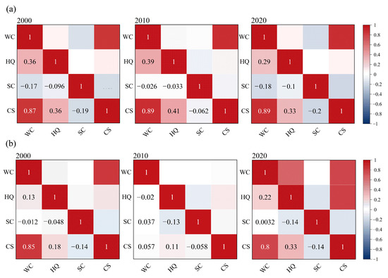 Spearman’s rank correlation coefficients of pairs of ESs in 2000, 2010, and 2020. (a) Shibing Karst WNHS. (b) Libo-Huanjiang Karst WNHS.