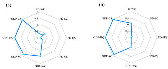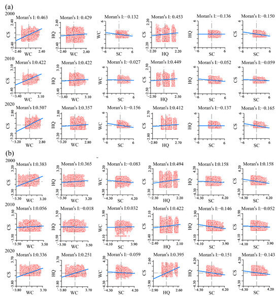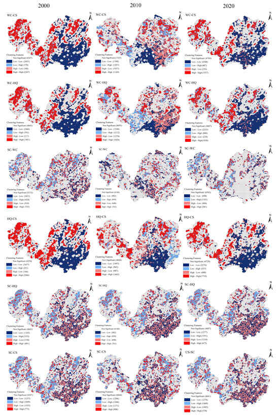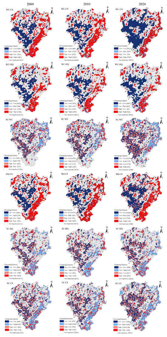 The scatterplot is divided into four quadrants, and each is centred on the mean value (Figure 6). The statistical analysis of each quadrant revealed that the two study area points in the graph are primarily distributed in quadrants 1 and 2. Among the indices, the global autocorrelation indices of CS and WC, HQ and WC, and HQ and CS of the Shibing from 2000 to 2020 were significantly positive at the level of 0.05. This indicates a positive spatial correlation, indicating synergy among the ESs. Furthermore, the synergistic strengths of WC and CS and of WC and HQ are decreasing and then increasing, while the synergistic strengths of HQ and CS are continuously increasing. The global autocorrelation indices of SC with WC, SC with HQ, and SC with CS are significantly negative at the level of 0.05, indicating a negative spatial autocorrelation. This suggests that the ESs are in a trade-off. The strength of the trade-offs between SC and WC and SC and CS is weakened and then strengthened, while the strength of the trade-offs between SC and HQ is strengthened and then weakened. In 2020, the strength of the trade-offs between SC and HQ reached a synergistic state, as indicated by the Moran’s index, which is −0.005.