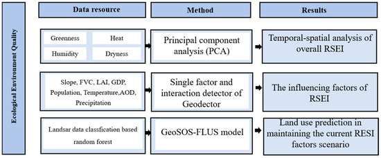 Through principal component analysis, this study first assessed the RSEI from 2000 to 2020, integrating four key indicators, including greenness, humidity, dryness, and heat. Then, this study employed Geodetector to analyze the spatial heterogeneity of the RSEI and identify the factors influencing ecological environment quality. Land use classification was performed using the Random Forest algorithm to classify land. Finally, we used the GeoSOS-FLUS model to simulate and predict land use changes, while maintaining the current ecological environment quality factors scenario and proposed suggestions about future land use and urban development (Figure 2).
