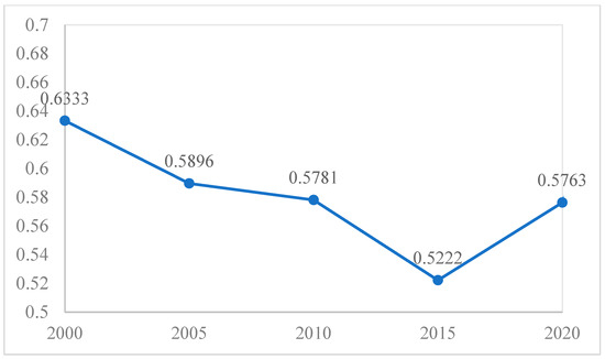 Through an analysis of the changes in RSEI results, the average values of RSEI in Changle District from 2000 to 2022 were as follows: 0.6333, 0.5896, 0.5781, 0.5222, and 0.5763 (Figure 4). The highest RSEI value in Changle District occurred in 2020 at 0.6625, while the lowest was recorded in 2015 at 0.5222. The annual average RSEI is 0.5937, indicating that the ecological environment quality in the Li River Basin is at a moderately high level. Overall, there is an upward trend in the ecological environment quality of the Li River Basin. The decrease in forest area may lead to ecosystem degradation and a reduction in biodiversity. Simultaneously, the expansion of farmland could result in ecosystem fragmentation and an increased risk of soil erosion. The proper planning of land use in Changle District is essential to promote the healthy development of ecosystems and mitigate the negative impact of human activities on the environment. It is crucial to strengthen monitoring and management to ensure the sustainability of land use, preventing excessive development and resource wastage. This proactive approach will contribute to maintaining a balance between human activities and environmental conservation.