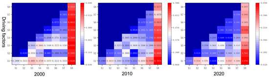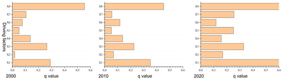 Figure 5. The results of single factor detection from 2000 to 2020. Note: X1 (vegetation coverage), X2 (average annual precipitation), X3 (aerosols), X4 (average annual temperature), X5 (per capita fiscal revenue), X6 (population density), X7 (slope), X8 (leaf area index).