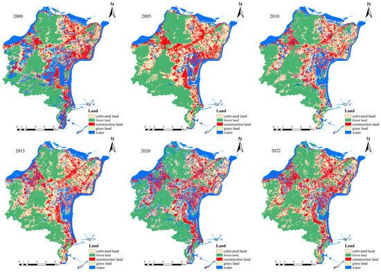 The area of construction land gradually increases from 2000 to 2020 (Figure 7). The Kappa values for land use classification in Changle District are all above 90%, and the overall accuracy is consistently above 0.9, indicating a high reliability for subsequent analysis. Changle District is predominantly covered by forest land, accounting for over 50% of the entire watershed, while the smallest proportion is occupied by grassland, representing only about 1% of the watershed area. From the year 2000 to 2022, the areas of forest land, water bodies, and construction land have all increased. Notably, there is a significant expansion of construction land, primarily in the southeast, northeast, and a small part of the eastern regions of Changle District. Meanwhile, there is a noticeable decrease in the area of cultivated land. Additionally, the increase in construction land is mainly attributed to the conversion of cultivated land.