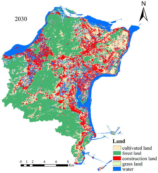 If maintaining the current RESI factors without any improvement, Changle District will experience continued urbanization and development, leading to an increase in built-up areas to 32.93% by 2030, at the expense of grasslands (Figure 8). The validated Kappa coefficient is 0.76, and the FOM index is 0.005, both falling within a good range, indicating the reliability of the GeoSOS-FLUS model. According to the GeoSOS-FLUS model, Changle District is projected to remain predominantly covered by forest and built-up areas, accounting for 51.85% and 32.93%. Grassland occupies the smallest proportion, constituting only 0.06% of Changle District’s total area. Influenced by urbanization and construction expansion, grassland areas have decreased, which is associated with factors such as urban expansion and agricultural land enlargement. In comparison to 2020, by 2030, all land classes in Changle District, except for arable land and built-up areas, show varying degrees of decline. Forest area exhibits the most significant decrease, followed by woodland and grassland. Arable land and built-up areas experience varying degrees of increase, possibly due to urbanization and agricultural development. Given the reduction in forest and grassland areas, it is essential to formulate sustainable land use planning for Changle District to protect natural ecosystems and biodiversity. In response to the increase in built-up areas in Changle District, effective urban planning and land use policies need to be devised to ensure the sustainability of urban development.
