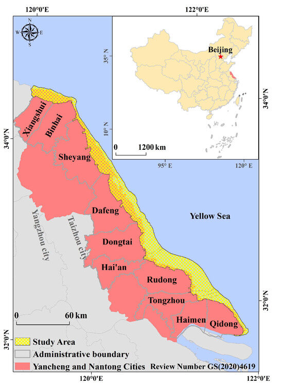This study also used administrative division data (http://bzdt.ch.mnr.gov.cn/ (accessed on 26 June 2024), Review number GS(2020)4619) and the Yancheng National Nature Reserve boundaries (https://www.resdc.cn/Default.aspx, accessed on 26 June 2024).