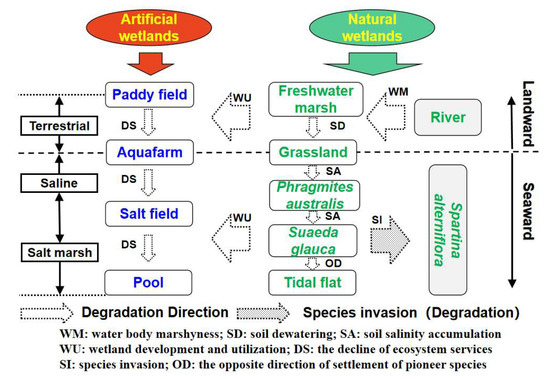 Coastal wetlands are a crucial landscape cover type and contain unique ecosystems that play a vital role in maintaining ecological balance and biodiversity [1]. Moreover, in such areas, marine–terrestrial interactions and human activity are intense. Large-scale reclamation activities alter the natural attributes of coastal wetlands and various environmental factors (such as tidal flat topography, hydrological conditions, dynamic characteristics, sedimentation features, and soil physicochemical properties), leading to changes in the quality of material cycles, energy flow, and information transmission. These changes affect ecosystem structures and functions at various levels, with a profound and complex impact on wetland degradation [2,3,4,5,6]. The cumulative impact of reclamation on wetland degradation has become one of the most pressing issues facing coastal areas [7].