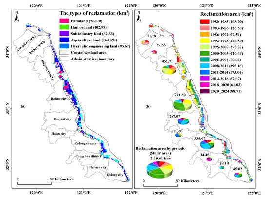 Between 1980 and 2024, 2119.61 km2 of coastal wetlands in Jiangsu were reclaimed, with an average annual reclamation rate of 48.17 km2 (Figure 3). The primary use of the reclaimed land was aquaculture, followed by agricultural planting, port construction, water conservancy projects, and sea salt production (Figure 3 and Figure S1). Spatially, reclamation intensity was stronger in the central regions of Jiangsu, with weaker activity in the northern and southern regions. The total reclamation area varied significantly among counties and cities. Dafeng City, Sheyang County, Rudong County, and Dongtai City each reclaimed more than 250 km2 of coastal wetlands between 1980 and 2018. In contrast, Hai’an City contained the smallest reclamation area of only 25.96 km2.
