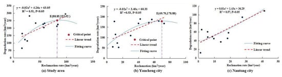 Based on the coefficients of the quadratic terms in the fitting equations, we observed that the wetland ecological degradation rates in the coastal wetland area and in Yancheng City initially increased and then decreased with increases in the reclamation rates. The reclamation rates corresponding to the extremal points of the fitted curves were 88.85 and 69.70 km2/year, respectively. In contrast, the wetland degradation rate in Nantong City exhibited a monotonically increasing trend with an increase in the reclamation rate. Additionally, based on the fitted equations, when the reclamation rate was >66.68 km2/year, the wetland degradation rate in Nantong City was greater than that in Yancheng City. When the reclamation rate was between 0 and 66.68 km2/year, the wetland degradation rate in Yancheng City exceeded that in Nantong City. These results demonstrate a clear relationship between reclamation and degradation in the Jiangsu coastal wetlands over the past 45 years. The polynomial nature of these relationships suggests that reclamation impacts on wetland degradation are complex and vary with the intensity of reclamation activities. This complexity underscores the need for nuanced and region-specific strategies to manage wetland conservation and reclamation projects and mitigate the adverse effects of reclamation on coastal wetland ecosystems.