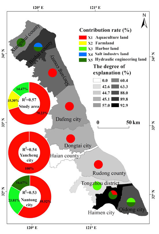 The contribution rates of the different reclamation types to wetland degradation varied by region. Across the entire coastal wetland area, aquaculture had the most significant impact on wetland degradation, followed by agricultural planting and port construction, whereas other reclamation types had the lowest impact. In Yancheng City, the primary reclamation type’s contribution rate and R2 equation were 100% (aquaculture) and 0.54, respectively, although aquaculture (59.52%), port construction (23.81%), and water conservancy projects (16.67%) also made significant contributions in Nantong City. Among the nine cities and counties with significant regression equations, the primary reclamation types were as follows: Xiangshui County (water conservancy projects), Binhai County (water conservancy projects and sea salt production), Tongzhou District (port construction), Haimen City (water conservancy projects), and Qidong City (water conservancy projects and port construction). The primary reclamation type for the remaining four counties and cities was aquaculture. Although the impacts of the different reclamation types in Hai’an City were not significant, aquaculture and port construction still contributed to local wetland degradation. This result highlights the varied impacts of reclamation activity on wetland degradation across different regions and emphasizes the dominant role of aquaculture in driving this process. These results underscore the need for targeted management and conservation strategies that consider specific reclamation practices and their ecological impacts in different areas to effectively address and mitigate wetland degradation.