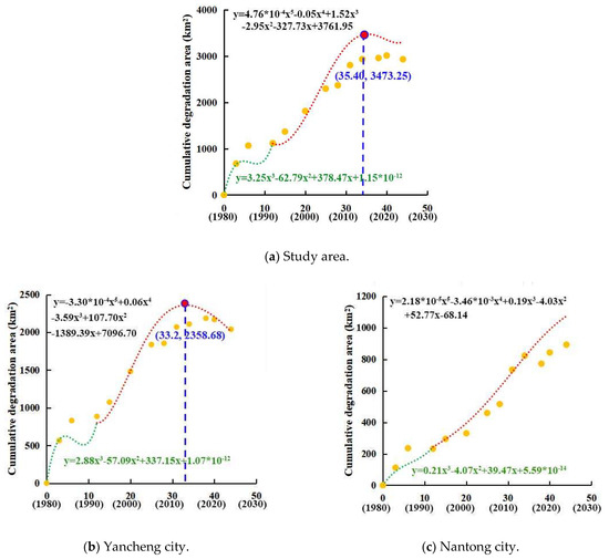 The optimal statistical relationship between the reclamation and wetland degradation rates (modeled in Figure 4) indicates that, for the entire coastal wetland area, Yancheng City coastal wetland area (study area northern region), and Nantong City coastal wetland area (study area southern region), the best-fit statistical models are polynomials, with all passing the necessary significance tests. The model equations explained 50.62, 52.74, and 57.40% of total variance in the degradation rates for the corresponding regions.