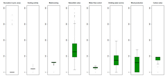 Figure 5, a certain variability of FESs in the study area is limited to some functions such as naturalistic value, drinking water service, wood production, and carbon value. Other values have a more constrained range; in particular, the concentration of protected area in a limited surface leads to a very low median value of recreation function.