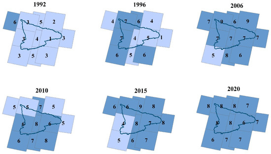 The number of valid Landsat images utilized for composite imagery synthesis for each target year. The blue lines outline the boundaries of the study area. The darker blue denotes that the number of available images is higher than five, while the lighter blue represents areas with fewer than five images.