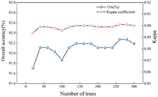 The RF algorithm, a typical machine learning approach, has demonstrated superior performance compared with other methods for glacier extraction [31]. In this study, we employed the RF algorithm from the GEE platform using the ArcGIS API for JavaScript (version 4.26, Esri, Redlands, CA, USA) to write a code that evaluates the impact of different number of decision trees on the classification accuracy of the RF model [32]. Taking 2020 as an example and using a step of 20, the parameters “number of Trees = 20, 40, 60, …, 300” were selected to determine the most beneficial number of decision trees. With the increase in the number of decision trees, the overall accuracy of the classification also increased [33]. When the number of trees reached 280, the values of OA (overall accuracy) and Kappa were the highest (Figure 3). Therefore, this study uses “number of Trees = 280” as the parameter for the random forest classification of 2020.