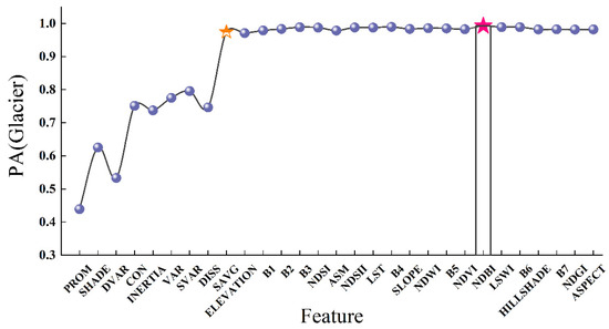 Variation in glacier producer accuracy (PA) with different features. The vertical columns indicate the specific features where significant changes in PA are observed. The yellow star denotes the feature where PA reaches near-perfect accuracy, indicating its highest contribution to the model’s performance. The red star represents the point beyond which adding more features does not significantly improve PA, suggesting an optimal feature set for the model.