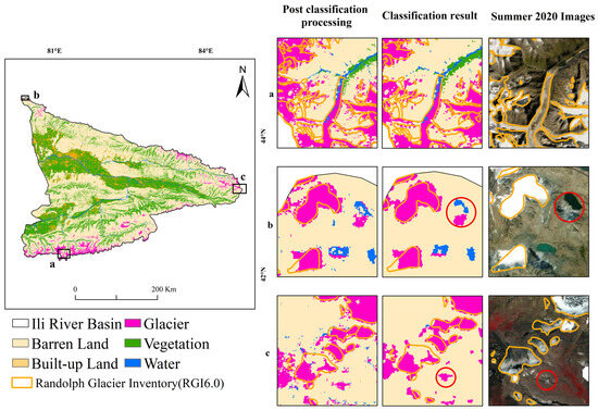 Three subsets of remote-sensing image (a–c) and their classification results for 2020. The orange lines represent the boundaries of glaciers as defined by the Randolph Glacier Inventory (RGI 6.0). The red circles highlight areas of discrepancies between the classification results and the RGI, indicating regions where manual inspection or further refinement may be necessary.