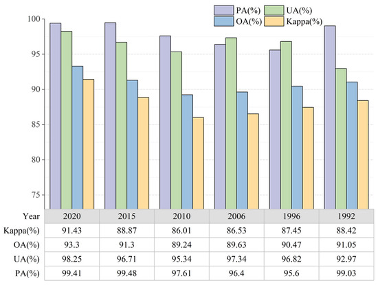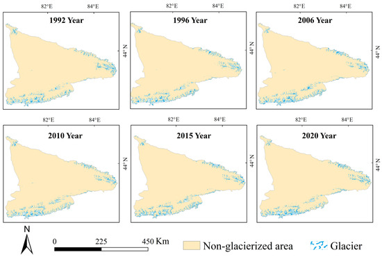 The glacier classification results for the Ili River Basin for 1992, 1996, 2006, 2010, 2015, and 2020 derived from the RF algorithm and post-classification processing are demonstrated in Figure 6. Glaciers are primarily scattered along the northern slopes of the Harktu Mountains to the south of the study area. Confusion matrices for the six target years derived from the GEE platform revealed that the OA, UA, producer accuracy (PA), and kappa coefficient (Figure 7) were commendable. Moreover, the kappa coefficients for each target year exceeded 85%, clearly demonstrating the robustness of RF algorithm. Regarding glacier classification, the high UA and PA, both exceeding 90%, highlight the effectiveness of the method in discriminating between glacier and nonglacial categories.