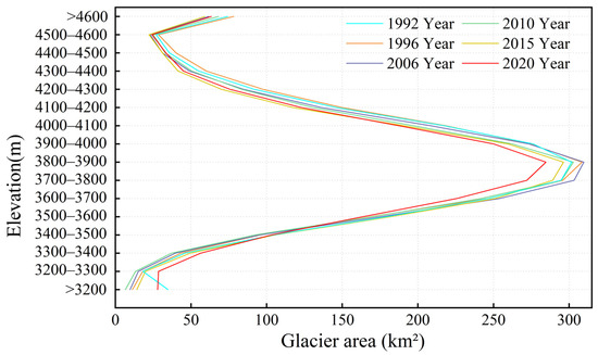 Variations in the areas of glaciers at different elevations in the Ili River Basin during 1992–2020.