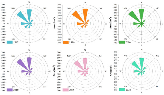 During the study period, glaciers in various areas of the Ili River Basin have exhibited an intermittent retreating trend. Because of factors such as mountainous terrain, glacier areas vary among different slopes, with approximately 60% of the glaciers located on the north, southwest, west, and northwest aspects (Figure 9). For instance, in 1992, the glacier areas on the north, southwest, west, and northwest slopes were 524.24 km2, 205.08 km2, 297.35 km2, and 557.07 km2, respectively, representing 24.40%, 13.84%, 25.93%, and 14.33% of the total glacier area in that year’s study area, respectively. The northwest slope had the largest glacier area among all aspects, whereas the east and southeast slopes had comparatively smaller glacier areas. Glaciers on the north, west, and northwest slopes had larger retreat rates, shrinking by 174.30 km2 from 1992 to 2020, with a notable decline after 2006. In contrast, glacier areas on the east, northeast, and south slopes demonstrated a consistent declining trend before 2010, followed by an expanding trend between 2010 and 2020.