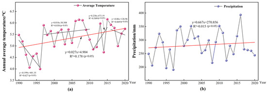 Annual air temperature and (a) and annual precipitation (b) in the Ili River Basin from 1992 to 2020. The red lines denote long term trend.
