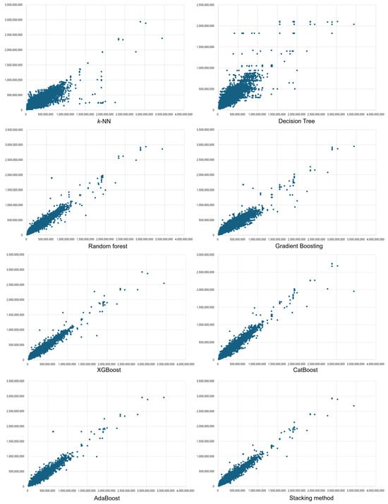 As mentioned earlier, while the stacked model can automatically identify the most suitable model regardless of the base algorithms used, this study primarily employs decision tree models as the base algorithms. Decision tree algorithms and their ensemble models, such as random forest (RF), gradient boosting, XGBoost, CatBoost, and AdaBoost, are particularly well-suited for real estate valuation tasks, as discussed in [
