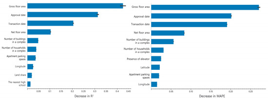 Figure 3 presents the results of the feature importance analysis. The left side shows how the model’s R-squared value changes when each variable is permuted, while the right side illustrates the changes in the mean absolute percentage error (MAPE). The results consistently indicate that the variables gross floor area, approval date, transaction date, net floor area, number of buildings in a complex, and number of households in a complex are the most important, in that order. This may be because, in the case of Korean real estate, many properties tend to have similar external appearances and internal layouts. Therefore, once the area (gross floor area, net floor area) and construction year are determined, the appearance and structure of the property and complex are likely to be similar. The transaction date might reflect the economic conditions or real estate policies of that particular year. Subsequently, variables such as latitude and longitude, which reflect locational value, appear in the order of importance.